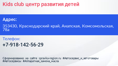 Kids club, центр развития детей по адресу 353430, Краснодарский край, Анапская, Комсомольская, 78а в дальнейшем Организация, размещена в следующих категориях: