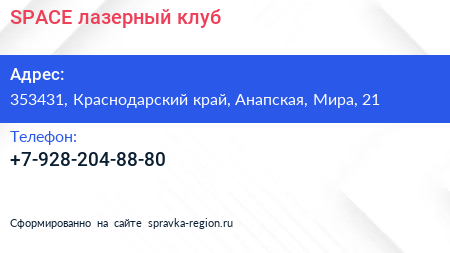 SPACE, лазерный клуб по адресу 353431, Краснодарский край, Анапская, Мира, 21 в дальнейшем Организация, размещена в следующих категориях: