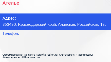 Ателье по адресу 353430, Краснодарский край, Анапская, Российская, 18а в дальнейшем Организация, размещена в следующих категориях: