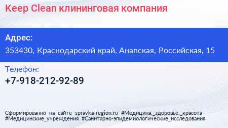 Keep Clean, клининговая компания по адресу 353430, Краснодарский край, Анапская, Российская, 15 в дальнейшем Организация, размещена в следующих категориях: