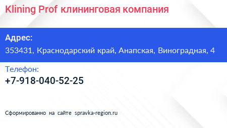 Klining Prof, клининговая компания по адресу 353431, Краснодарский край, Анапская, Виноградная, 4 в дальнейшем Организация, размещена в следующих категориях: