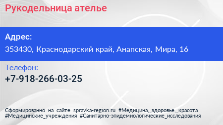 Рукодельница, ателье по адресу 353430, Краснодарский край, Анапская, Мира, 16 в дальнейшем Организация, размещена в следующих категориях: