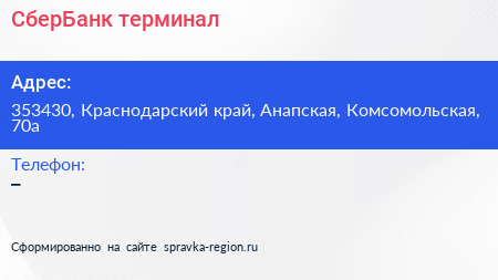 СберБанк, терминал по адресу 353430, Краснодарский край, Анапская, Комсомольская, 70а в дальнейшем Организация, размещена в следующих категориях: