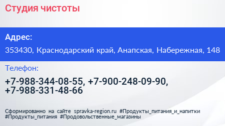Студия чистоты по адресу 353430, Краснодарский край, Анапская, Набережная, 148 в дальнейшем Организация, размещена в следующих категориях: