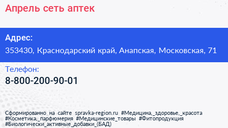 Апрель, сеть аптек по адресу 353430, Краснодарский край, Анапская, Московская, 71 в дальнейшем Организация, размещена в следующих категориях: