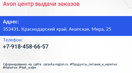 Avon, центр выдачи заказов по адресу 353431, Краснодарский край, Анапская, Мира, 25 в дальнейшем Организация, размещена в следующих категориях:
