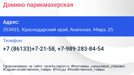 Домино, парикмахерская по адресу 353431, Краснодарский край, Анапская, Мира, 25 в дальнейшем Организация, размещена в следующих категориях: