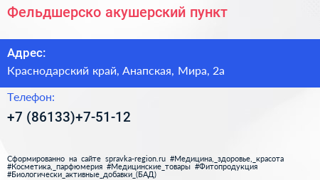 Фельдшерско-акушерский пункт по адресу Краснодарский край, Анапская, Мира, 2а в дальнейшем Организация, размещена в следующих категориях: