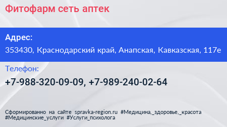 Фитофарм, сеть аптек по адресу 353430, Краснодарский край, Анапская, Кавказская, 117е в дальнейшем Организация, размещена в следующих категориях: