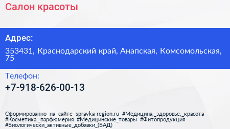 Салон красоты по адресу 353431, Краснодарский край, Анапская, Комсомольская, 75 в дальнейшем Организация, размещена в следующих категориях: