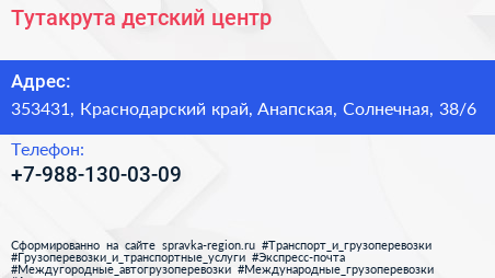 Тутакрута, детский центр по адресу 353431, Краснодарский край, Анапская, Солнечная, 38/6 в дальнейшем Организация, размещена в следующих категориях: