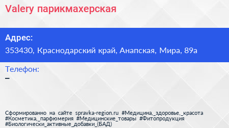 Valery, парикмахерская по адресу 353430, Краснодарский край, Анапская, Мира, 89а в дальнейшем Организация, размещена в следующих категориях: