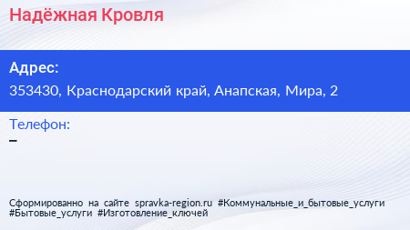 Надёжная Кровля по адресу 353430, Краснодарский край, Анапская, Мира, 2 в дальнейшем Организация, размещена в следующих категориях: