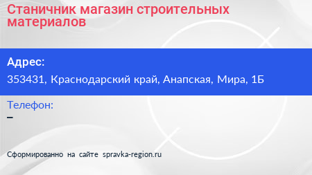 Станичник, магазин строительных материалов по адресу 353431, Краснодарский край, Анапская, Мира, 1Б в дальнейшем Организация, размещена в следующих категориях: