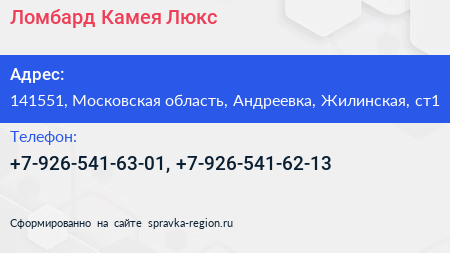 Ломбард Камея Люкс по адресу 141551, Московская область, Андреевка, Жилинская, ст1 в дальнейшем Организация, размещена в следующих категориях: