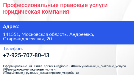Профессиональные правовые услуги, юридическая компания по адресу 141551, Московская область, Андреевка, Староандреевская, 20 в дальнейшем Организация, размещена в следующих категориях:
