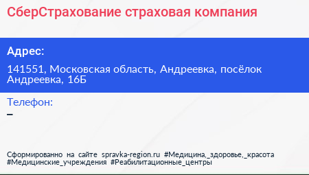 СберСтрахование, страховая компания по адресу 141551, Московская область, Андреевка, посёлок Андреевка, 16Б в дальнейшем Организация, размещена в следующих категориях: