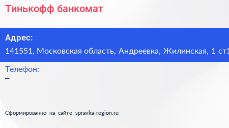 Тинькофф, банкомат по адресу 141551, Московская область, Андреевка, Жилинская, 1 ст1 в дальнейшем Организация, размещена в следующих категориях: