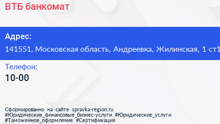 ВТБ, банкомат по адресу 141551, Московская область, Андреевка, Жилинская, 1 ст1 в дальнейшем Организация, размещена в следующих категориях: