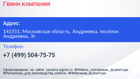 Гвинн, компания по адресу 141551, Московская область, Андреевка, посёлок Андреевка, 3г в дальнейшем Организация, размещена в следующих категориях: