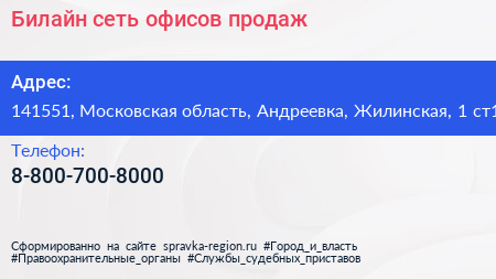 Билайн, сеть офисов продаж по адресу 141551, Московская область, Андреевка, Жилинская, 1 ст1 в дальнейшем Организация, размещена в следующих категориях: