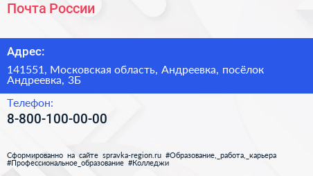 Почта России по адресу 141551, Московская область, Андреевка, посёлок Андреевка, 3Б в дальнейшем Организация, размещена в следующих категориях:
