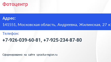 Фотоцентр по адресу 141551, Московская область, Андреевка, Жилинская, 27 к1 в дальнейшем Организация, размещена в следующих категориях: