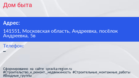 Дом быта по адресу 141551, Московская область, Андреевка, посёлок Андреевка, 5в в дальнейшем Организация, размещена в следующих категориях: