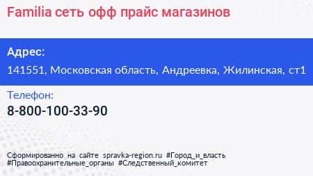 Familia, сеть офф-прайс магазинов по адресу 141551, Московская область, Андреевка, Жилинская, ст1 в дальнейшем Организация, размещена в следующих категориях: