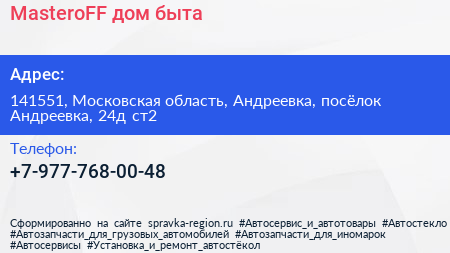 MasteroFF, дом быта по адресу 141551, Московская область, Андреевка, посёлок Андреевка, 24д ст2 в дальнейшем Организация, размещена в следующих категориях: