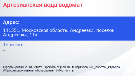 Артезианская вода, водомат по адресу 141551, Московская область, Андреевка, посёлок Андреевка, 11а в дальнейшем Организация, размещена в следующих категориях: