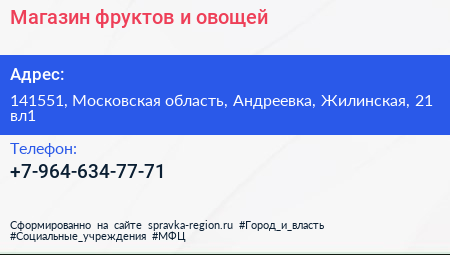 Магазин фруктов и овощей по адресу 141551, Московская область, Андреевка, Жилинская, 21 вл1 в дальнейшем Организация, размещена в следующих категориях: