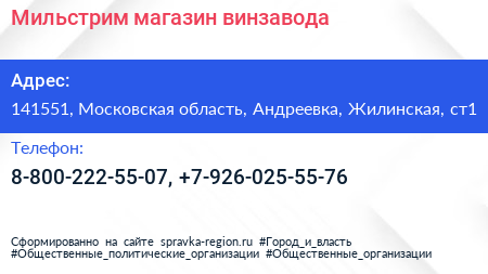 Мильстрим, магазин винзавода по адресу 141551, Московская область, Андреевка, Жилинская, ст1 в дальнейшем Организация, размещена в следующих категориях: