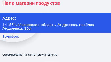 Налк, магазин продуктов по адресу 141551, Московская область, Андреевка, посёлок Андреевка, 16а в дальнейшем Организация, размещена в следующих категориях: