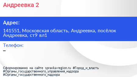 Андреевка-2 по адресу 141551, Московская область, Андреевка, посёлок Андреевка, ст9 вл1 в дальнейшем Организация, размещена в следующих категориях:
