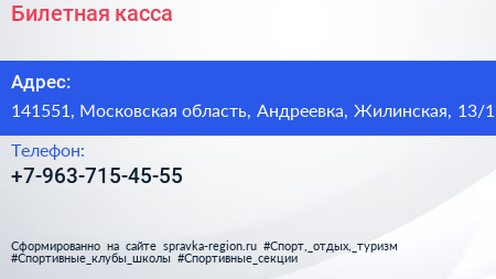 Билетная касса по адресу 141551, Московская область, Андреевка, Жилинская, 13/1 в дальнейшем Организация, размещена в следующих категориях: