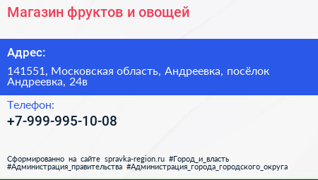 Магазин фруктов и овощей по адресу 141551, Московская область, Андреевка, посёлок Андреевка, 24в в дальнейшем Организация, размещена в следующих категориях: