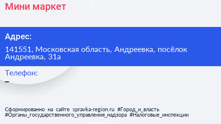 Мини-маркет по адресу 141551, Московская область, Андреевка, посёлок Андреевка, 31а в дальнейшем Организация, размещена в следующих категориях:
