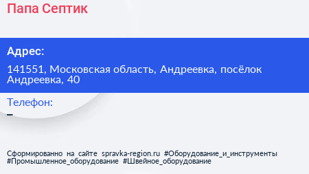 Папа Септик по адресу 141551, Московская область, Андреевка, посёлок Андреевка, 40 в дальнейшем Организация, размещена в следующих категориях: