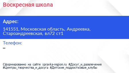 Воскресная школа по адресу 141551, Московская область, Андреевка, Староандреевская, вл72 ст1 в дальнейшем Организация, размещена в следующих категориях: