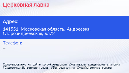 Церковная лавка по адресу 141551, Московская область, Андреевка, Староандреевская, вл72 в дальнейшем Организация, размещена в следующих категориях: