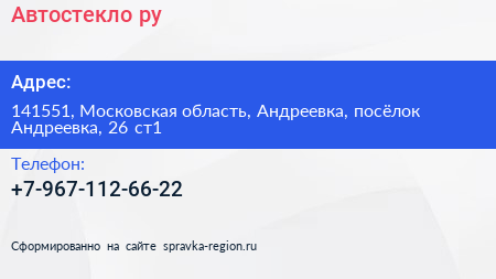 Автостекло.ру по адресу 141551, Московская область, Андреевка, посёлок Андреевка, 26 ст1 в дальнейшем Организация, размещена в следующих категориях: