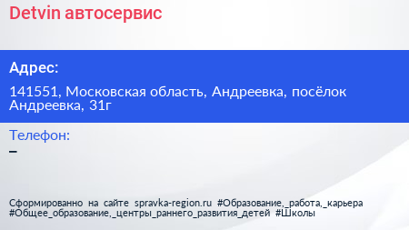 Detvin, автосервис по адресу 141551, Московская область, Андреевка, посёлок Андреевка, 31г в дальнейшем Организация, размещена в следующих категориях:
