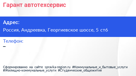 Гарант, автотехсервис по адресу Рынок стройматериалов, Георгиевское шоссе, Высокое, Зеленоград, городской округ Солнечногорск, Московская область, Центральный федеральный округ, 124365, Россия в дальнейшем Организация, размещена в следующих категориях: