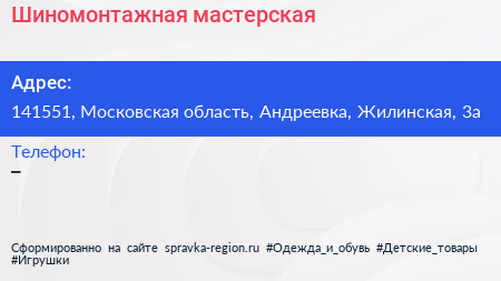 Шиномонтажная мастерская по адресу 141551, Московская область, Андреевка, Жилинская, 3а в дальнейшем Организация, размещена в следующих категориях: