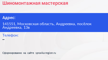 Шиномонтажная мастерская по адресу 141551, Московская область, Андреевка, посёлок Андреевка, 13в в дальнейшем Организация, размещена в следующих категориях: