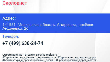 Сколовнет по адресу 141551, Московская область, Андреевка, посёлок Андреевка, 26 в дальнейшем Организация, размещена в следующих категориях: