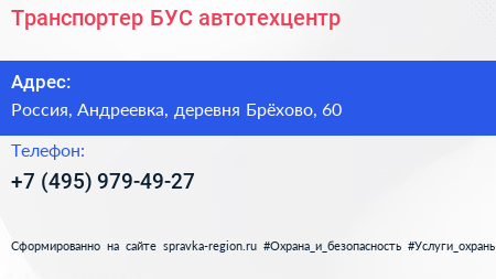 Транспортер-БУС, автотехцентр по адресу Клуб Транспортер Бус, 60, Пятницкое шоссе, Школьный микрорайон, Брёхово, городской округ Химки, Московская область, Центральный федеральный округ, 141544, Россия в дальнейшем Организация, размещена в следующих категориях: