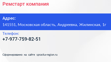 Ремстарт, компания по адресу 141551, Московская область, Андреевка, Жилинская, 1г в дальнейшем Организация, размещена в следующих категориях: