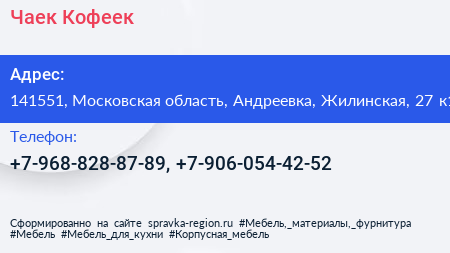 Чаек-Кофеек по адресу 141551, Московская область, Андреевка, Жилинская, 27 к1 в дальнейшем Организация, размещена в следующих категориях: